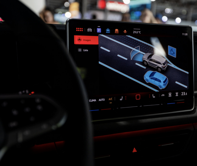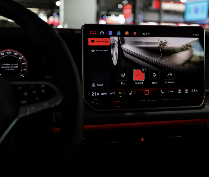 Entrá y descubrí un interior con pantalla central de 12.9” y AppConnect inalámbrico que integra tu móvil con Apple CarPlay o Android Auto. Seis bocinas más una central llenan la cabina de tu playlist favorita, mientras la iluminación ambiental ajusta el mood. El asiento del conductor con ajustes eléctricos y el volante multifunción forrado en cuero confirman que el confort también puede ser deportivo. El climatizador “Climatronic” de 3 zonas mantiene a todos felices.